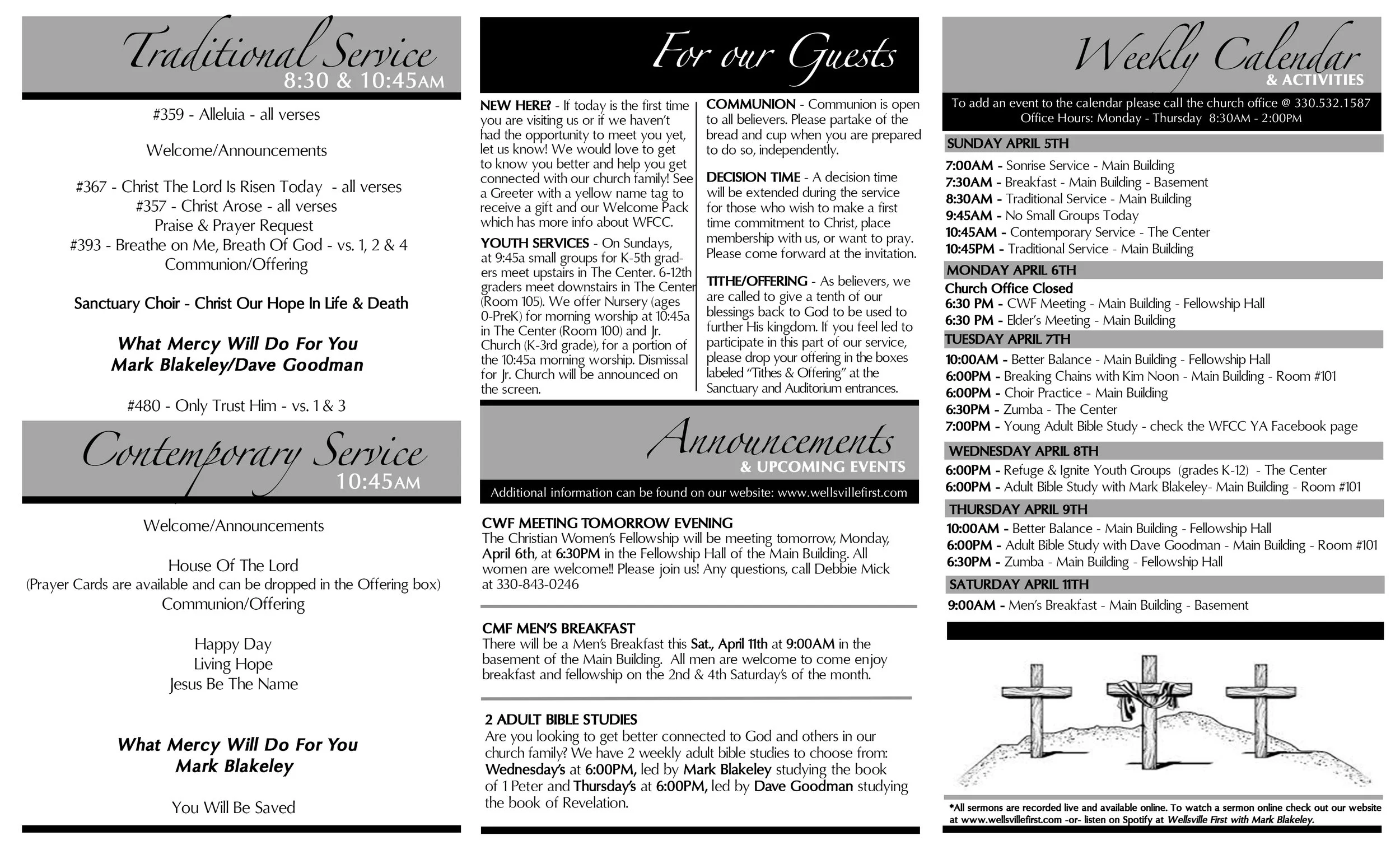 Bulletin - 4/5/26 Wednesday, April 1, 2026 2:00 PM 14:00 Thursday, April 9, 2026 3:00 PM 15:00 Wellsville First Christian Church 831 Main Street Wellsville, OH, 43968 United States (map) Google Calendar ICS